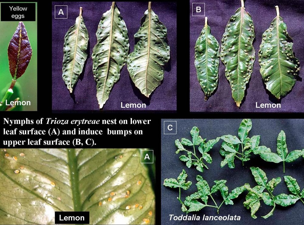 Upper left: yellow eggs of Trioza erytreae are seen along the midrib and on the edges of a young lemon leaf. Nymphs of T. erytreae develop in individual pits or nests on the lower leaf surface, and to each nest corresponds, on the upper leaf surface, a “bump”. The three leaves of A show, on their lower leaf surface, the nests left empty by the development of the nymphs into adults, and the upper surface of the three same leaves (B) shows the bumps corresponding to the nests. Some citrus relatives such as Toddalia lanceolata (C) are also hosts of T. erytreae, as shown by the “bumps” – J. M. Bové |