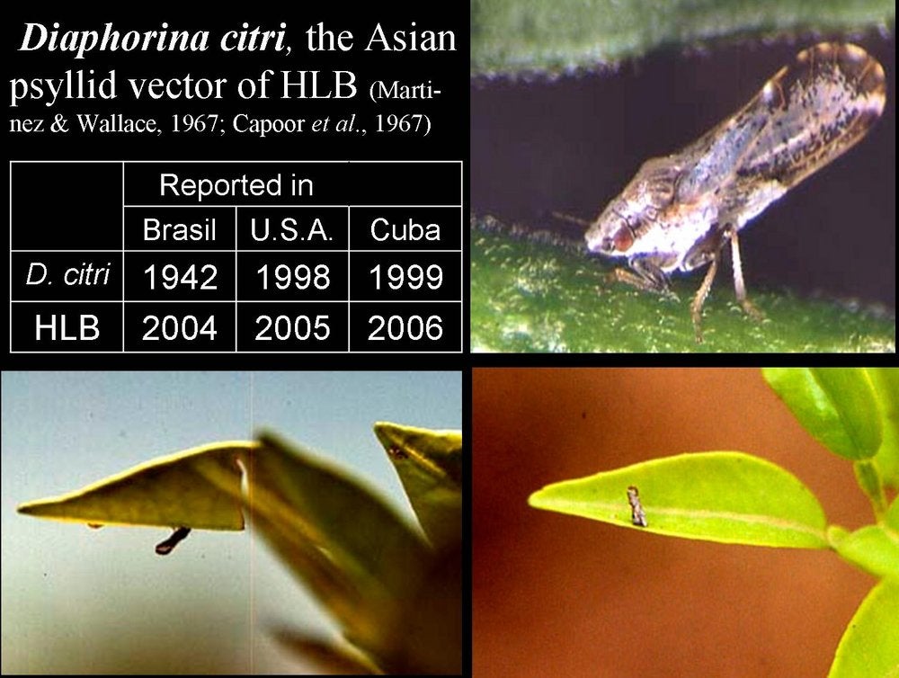 - by the Asian psyllid, Diaphorina citri (HLB. 111, 114) (Capoor et al., 1967; Martinez and Wallace, 1967) in Asia, South-East Asia, North-, Central-, and South-America where the Asian psyllid transmits both the Asian and the American liberibacter (Yamamoto et al., 2006), western Saudi Arabia, south and south-eastern Iran;