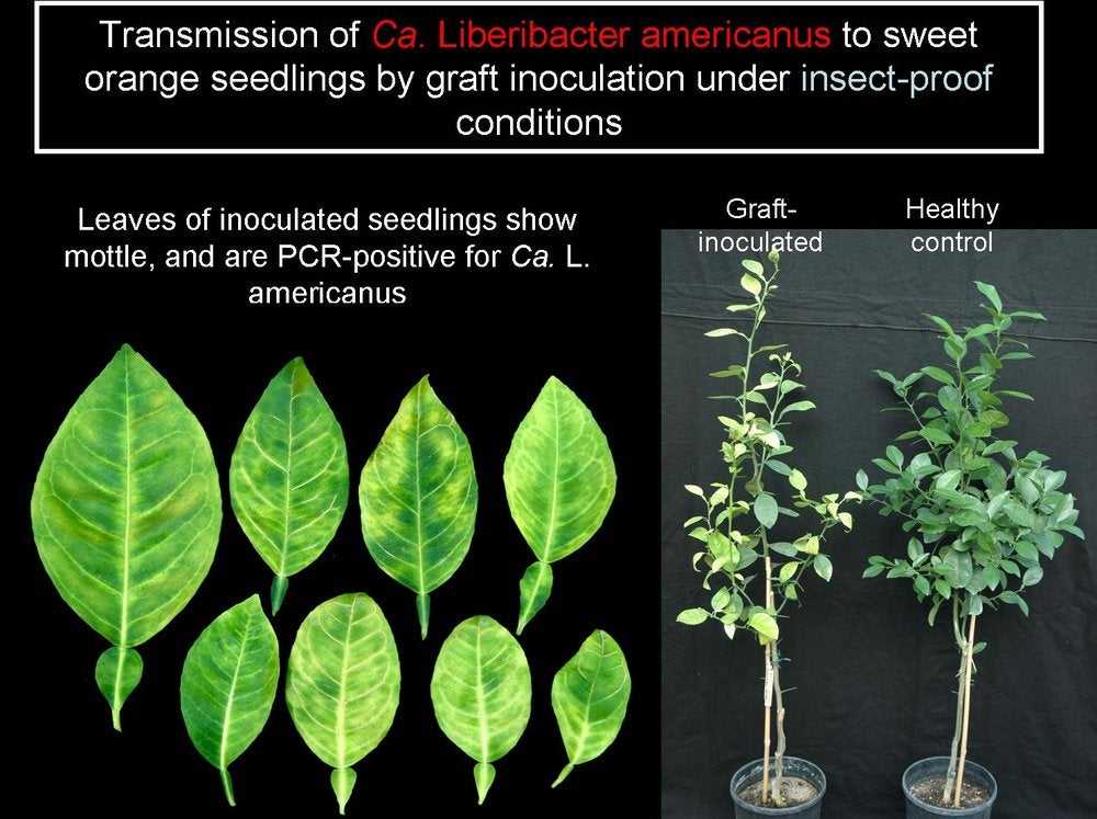 Graft inoculation with shoots, buds, and bark from shoots or roots, leaf patches (HLB. 116).