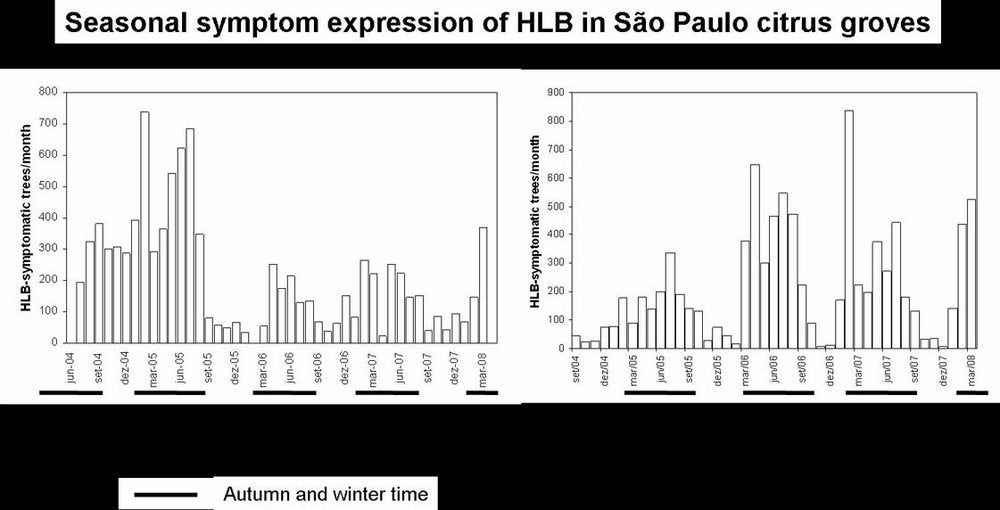 Seasonal symptom expression of HLB in São Paulo citrus groves. Expression of HLB symptoms is much better in the cool, autumn and winter months (March to September). Therefore the number of symptomatic trees detected in that period is much higher than in the spring and summer months (São Paulo State, Brazil) - R. B. Bassanezi |