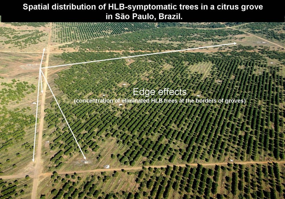 Spatial distribution of HLB-symptomatic trees in a citrus grove in São Paulo State, Brazil. The photo illustrates the “edge effect”, namely the fact that symptomatic trees are concentrated at the borders of groves. This edge effect is well seen on this photo, as the symptomatic trees, once identified, have been removed - R. B. Bassanezi |