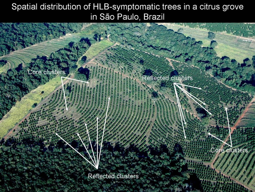 Spatial distribution of HLB-symptomatic trees in a citrus grove in São Paulo State, Brazil. The photo illustrates the “core clusters” and the “reflected clusters” - R. B. Bassanezi |