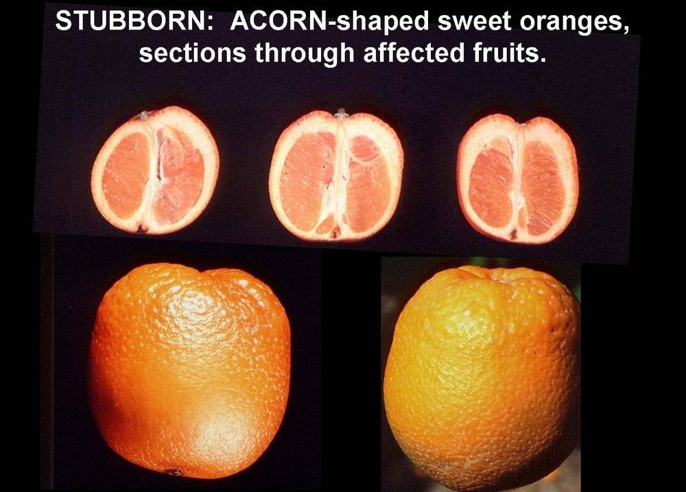 Comparison of fruit symptoms of stubborn with those of HLB. Acorn-shaped fruits are characteristic of “stubborn”, a disease caused by the helical mycoplasma, Spiroplasma citri. The two acorn-shaped navel sweet oranges in the bottom part of the photo have a coarse rind at the peduncular ends of the fruits (reminiscent of the acorn cupule), and a smooth rind at the stylar ends (reminiscent of the smooth acorn part, which sticks out of the cupule). The two half fruits at the upper right represent sections through acorn-shaped fruits, and show that the albedo at the peduncular end is thick, while at the stylar end, it is very thin. Also, the navels of acorn-shaped fruits are often more or less closed. Stubborn fruits can also be lopsided (upper left) and resemble HLB-affected fruit. See also (HLB. 122) – Juan Gil |