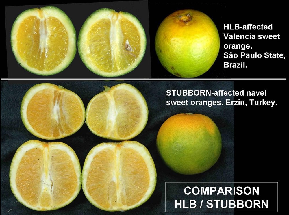 Comparison of fruit symptoms of stubborn with those of HLB. Both stubborn-affected sweet oranges (lower part of photo) and HLB-affected sweet oranges (upper part of photo) show colour inversion. Stubborn-affected fruits, like HLB-affected fruits, may be lopsided. Other fruit symptoms shared by the two diseases include seed abortion, brownish-stained vascular bundles at the peduncular end of the fruit axis, thick albedo at the peduncular fruit end, thin albedo at the stylar end. However, the albedo at the stylar end is thinner with stubborn than with HLB (São Paulo State,Brazil, and Erzin, Turkey) – J. M. Bové |