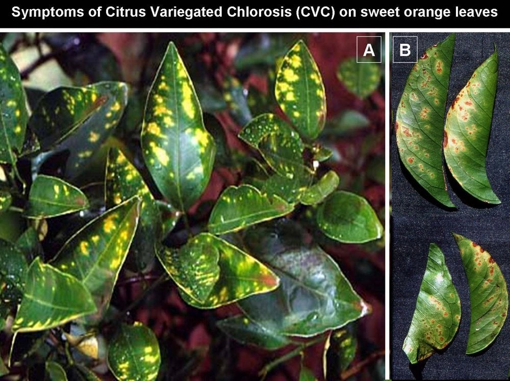 Comparison of leaf symptoms of HLB with those of citrus variegated chlorosis (CVC). In addition to leaf blotchy mottle, HLB-affected trees often show leaves with zinc deficiency symptoms. These symptoms should not be confused with CVC leaf symptoms (A) which have yellow discolorations in the interveinal tissue, and resemble those of zinc deficiency. Confusion can be avoided by examining the lower leaf suface; in the case of CVC, brownish-stained material is present in the areas of yellow discoloration, leading sometimes to tissue necrosis. No such material is present in the case of genuine zinc deficiency or HLB-induced zinc deficiency (São Paulo State, Brazil) – J. M. Bové |