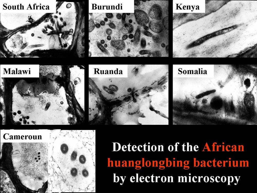 Electron microscopy detection of the HLB liberibacter in citrus from several African countries (Bordeaux, France) – M. Garnier and J. M. Bové |