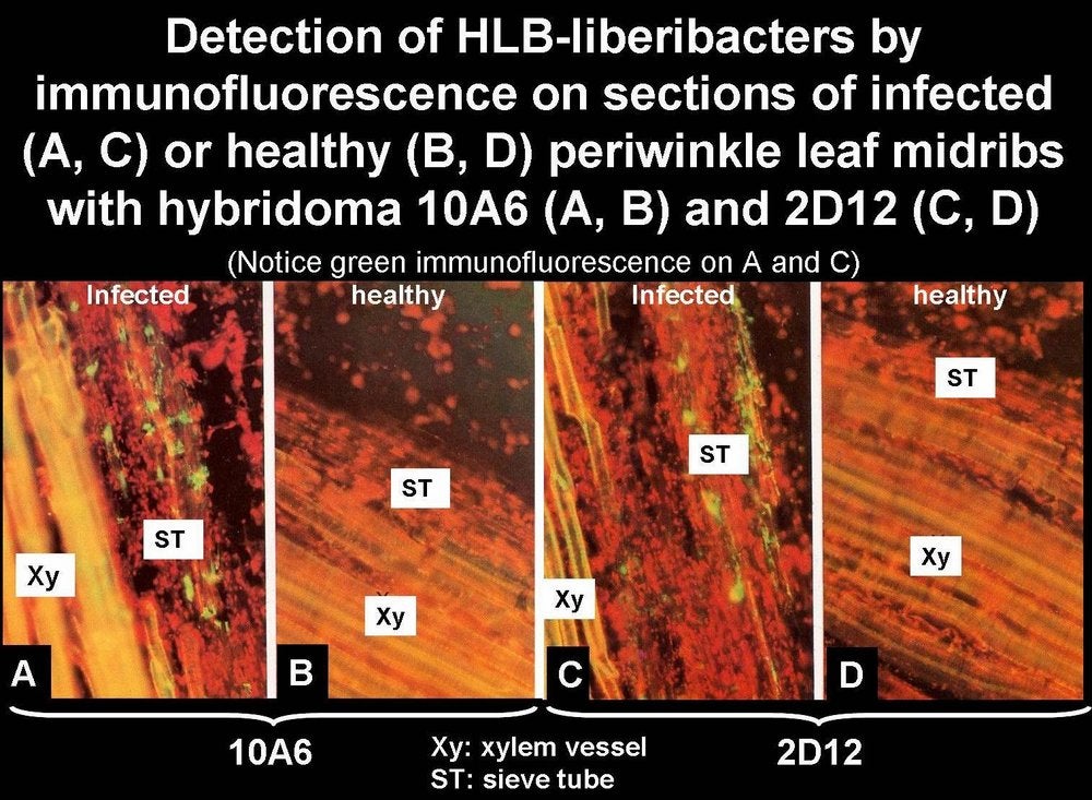 Detection of HLB liberibacters by immunifluorescence with liberibacter-specific monoclonal antibodies (Bordeaux, France) – M. Garnier, S. Gao and J. M. Bové |
