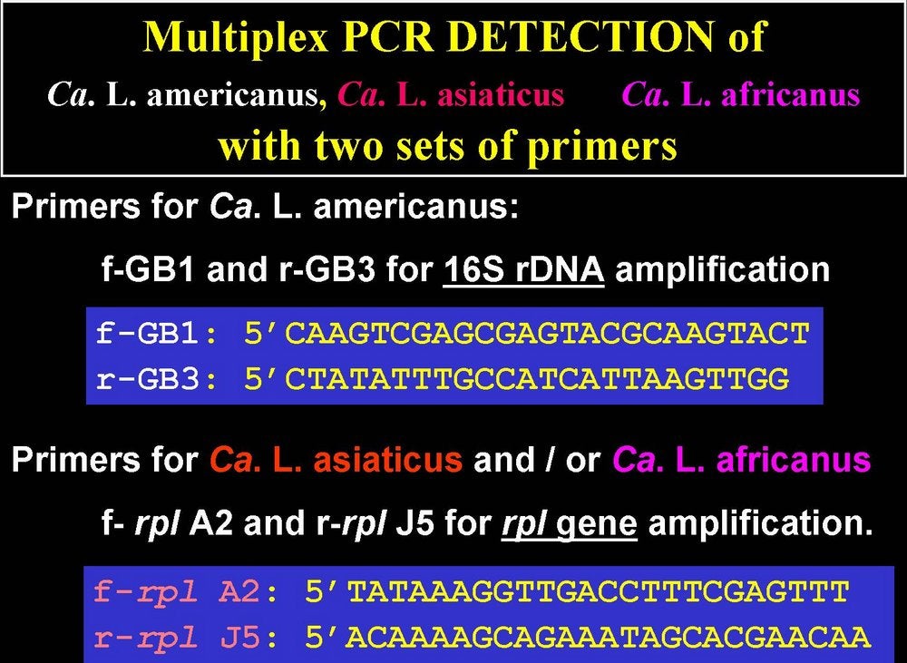 Multiplex PCR detection of Ca. L. americanus, Ca. L. asiaticus, and Ca. L. africanus with two sets of primers: description of primers (São Paulo State, Brazil) - D. C. Teixeira and J. M. Bové |