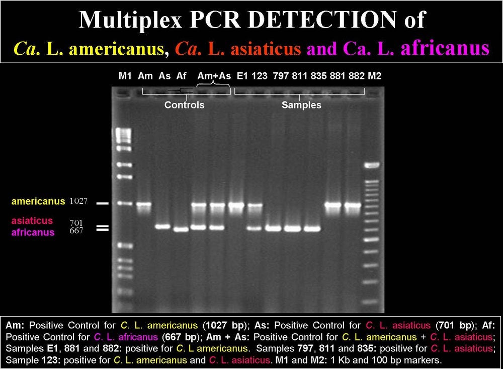 Multiplex PCR detection of Ca. L. americanus, Ca. L. asiaticus, and Ca. L. africanus with two sets of primers: visualization of amplicons by agarose gel electrophoresis (São Paulo State, Brazil) - D. C. Teixeira and J. M. Bové |