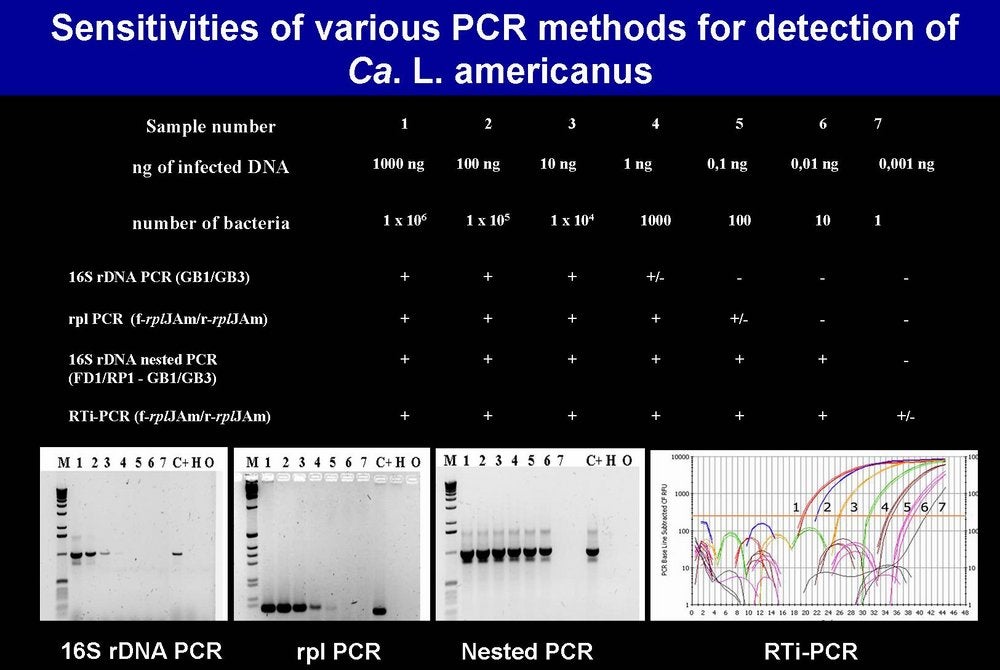 Sensitivities of various PCR methods for detection of Ca. L. americanus. As shown on the table, 16S rDNA PCR still gives a positive reaction (+) with sample 3, which corresponds to 104 liberibacters/assay (l/a); rpl PCR is 10 times more sensitive, as it gives a positive reaction with sample 4 (103 l/a); nested PCR and Real Time PCR are 1000 times more sensitive as they give positive reactions with sample 6 (10 l/a) (Bordeaux, Fance) - D. C. Teixeira, C. Saillard, S. Eveillard and J. M. Bové |
