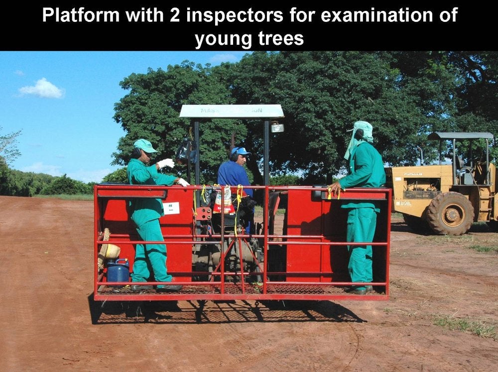 Rear view of tractor and “platform” with two inspectors to survey young orchards for identification of trees with HLB symptoms (São Paulo State, Brazil) – F. Tersi |