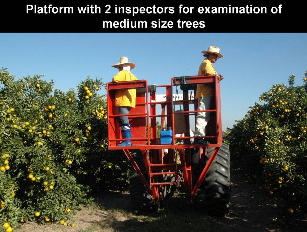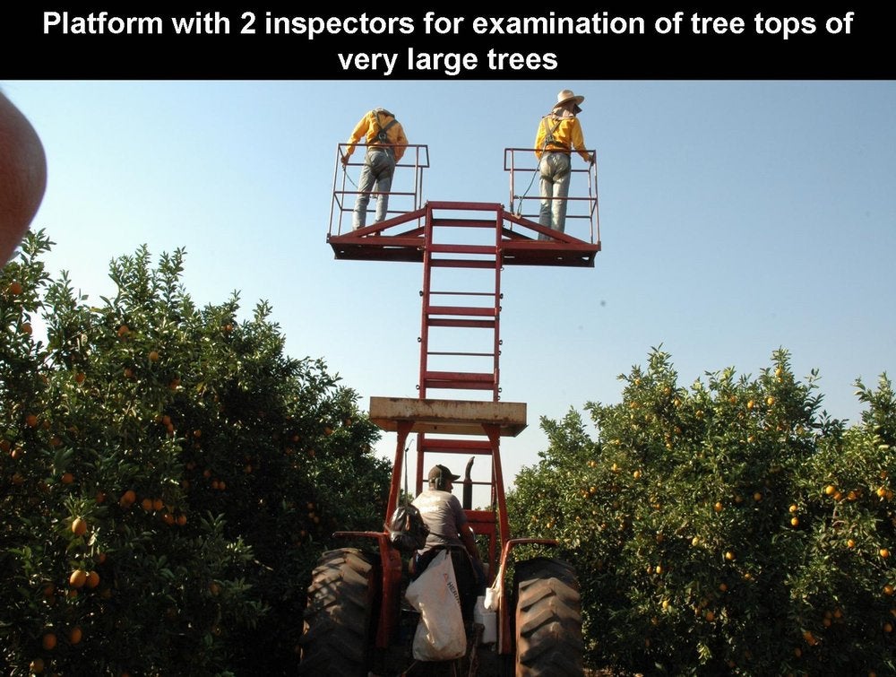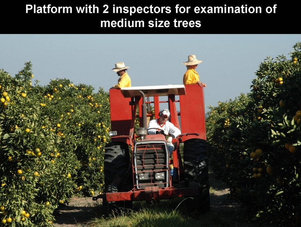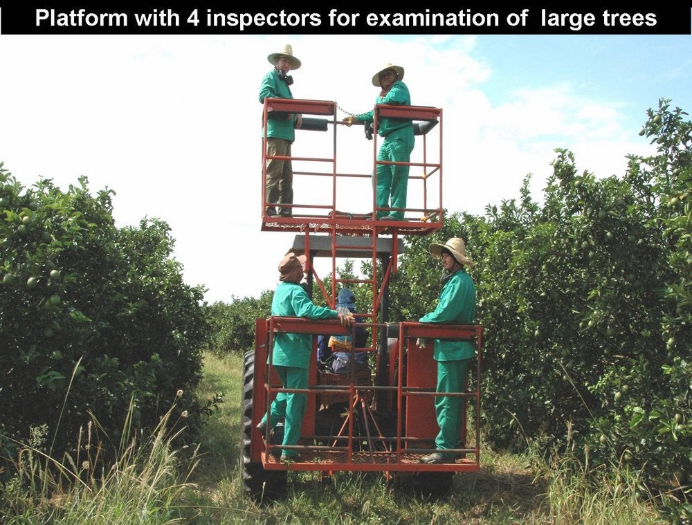 Four-inspector platform to survey large tree orchards for HLB symptoms. This platform allows simultaneous inspection of the sides of the trees and of the tree tops, where symptoms often show up (São Paulo State, Brazil) - J. M. Bové |