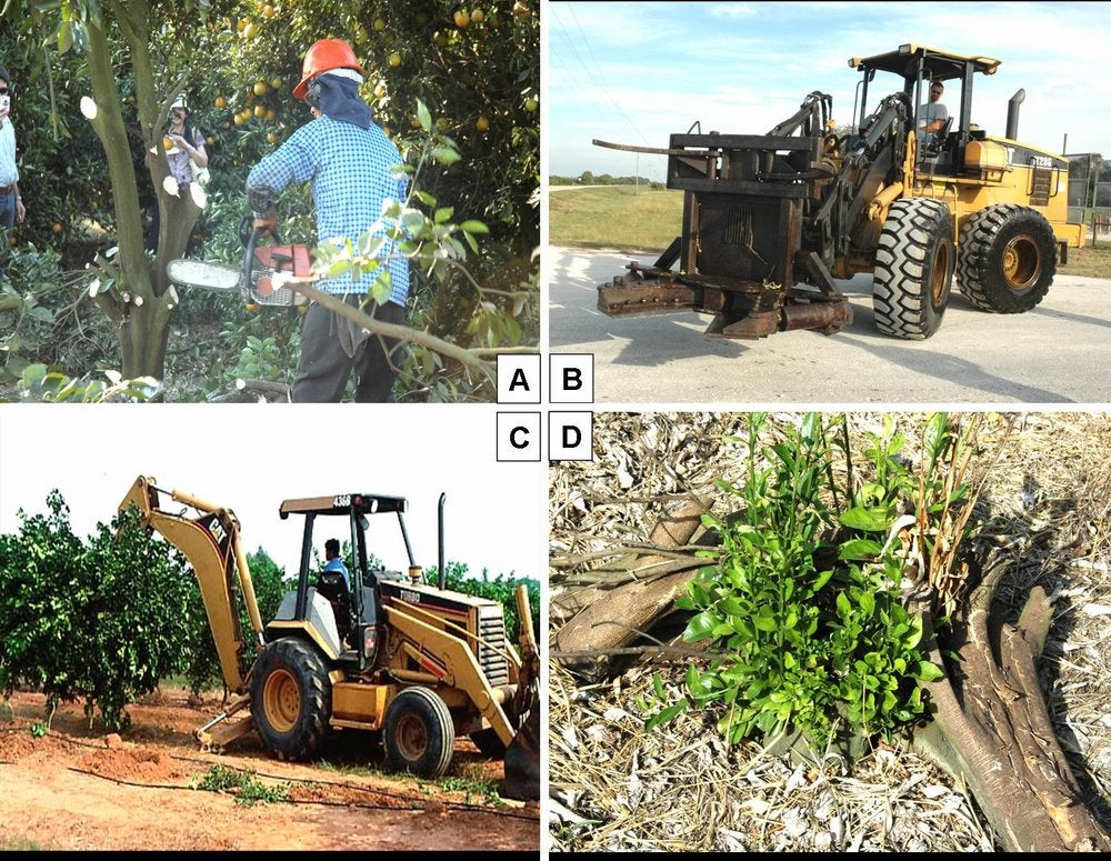 Once identified, symptomatic trees must be removed. This can be done by cutting the trees with a saw (A), with a clipper (B), or by pulling the tree out of the soil (C). With method A and B, the tree stumps remain in the soil; with method C, roots remain in the soil. The development of shoots (D) on the remaining stumps and/or roots must be prevented (São Paulo State, Brazil) - J. M. Bové |