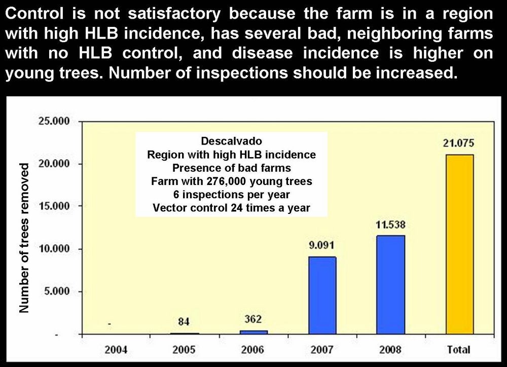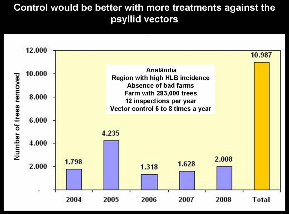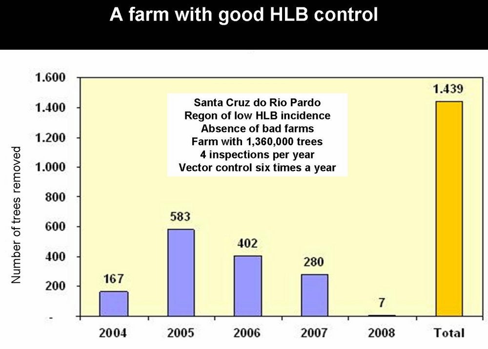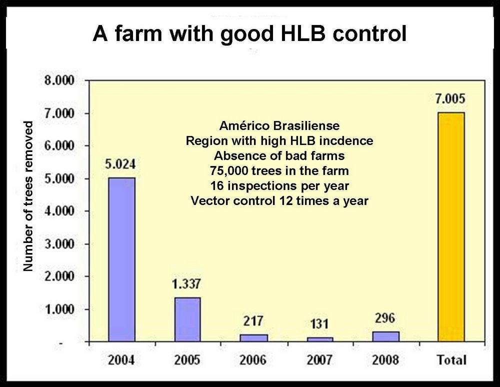 Importance. HLB is a destructive disease, probably the most serious disease of sweet orange, mandarin and grapefruit trees, witches’ broom disease of lime being as bad, if not worse, for small-fruited, acid lime (C. aurantifolia). Once a tree carries Asian HLB, it will soon decline and become un-economical. Therefore, the only control method is prevention, i.e. preventing trees from becoming infected. It is estimated that close to 100 million trees are affected, worldwide. In the northern and eastern regions of Thailand, 95% of trees were affected as of 1981. In the Philippines, from 1961 to 1970, the citrus acreage was reduced by 60%. In Java and Sumatra, 3 million trees were destroyed from 1960 to 1970, and Bali lost 3.6 million trees from 1984 to 1987. In the south-western oases of Saudi Arabia, HLB, being spread by D. citri, had killed, by 1983, most sweet orange and mandarin trees. South Africa, at a time when Trioza erytreae was not yet seriously controlled with systemic insecticides, has paid a heavy toll to HLB. In the northern part of the country, in the White River region, citrus has been wiped out; in the Tzaneen region, citrus has been replaced by avocado; the Hazy View area has lost 90% of its citrus; and other regions are riddled with HLB (H. Le Roux, CRI, Nelspruit, S.A.) Free of HLB for many years, the Cape region of South Africa became affected with HLB in the late 1990s. Reunion Island lost its entire citrus in the 1960s. In SSP (Brazil), where HLB was recognized in March 2004, close to 3 million HLB-affected sweet orange trees have been eradicated since mid-2004 in the frame of the HLB-control programme. In Florida, HLB was reported in 2005. By 2008, the situation has become so serious, that the very existence of citrus is endangered, as no intensive control measures of HLB have been advocated and applied, except for some notable private efforts.