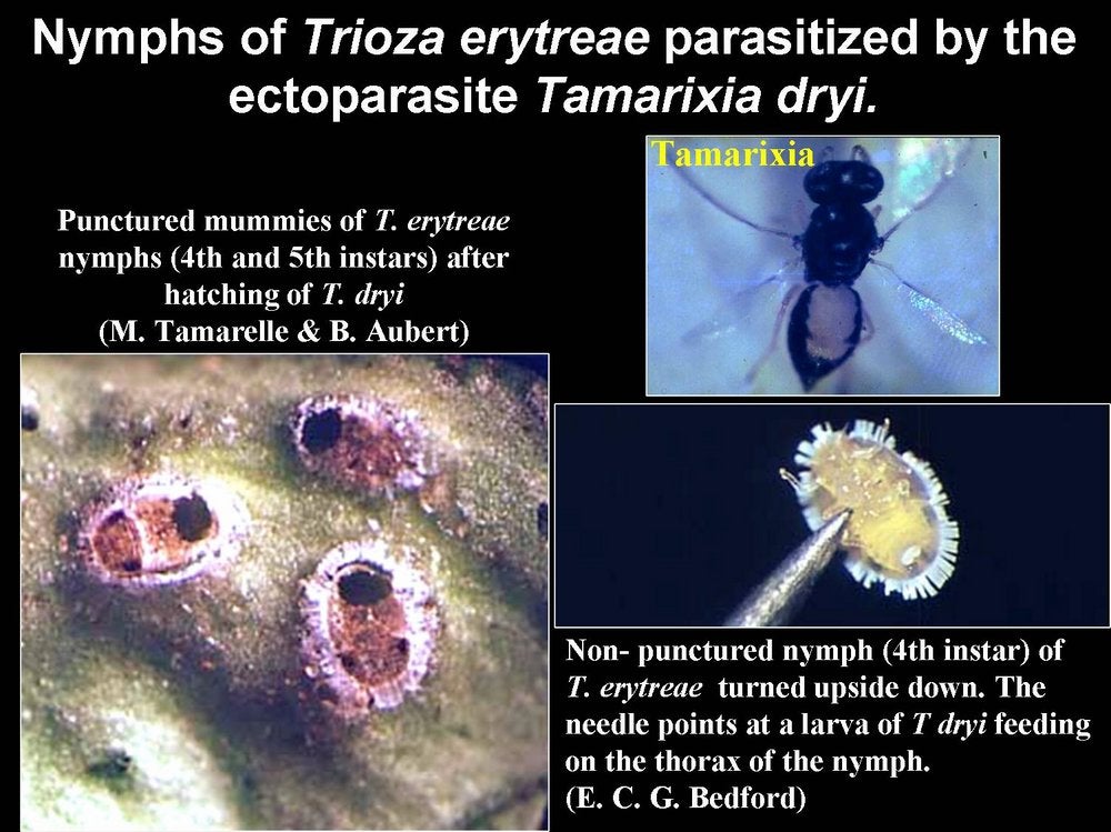 Nymphs of Trioza erytreae parasitized by the ectoparasite, Tamarixia dryi – B. Aubert, E. C. G. Bedford and J. M. Bové |