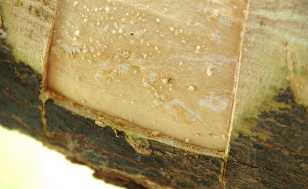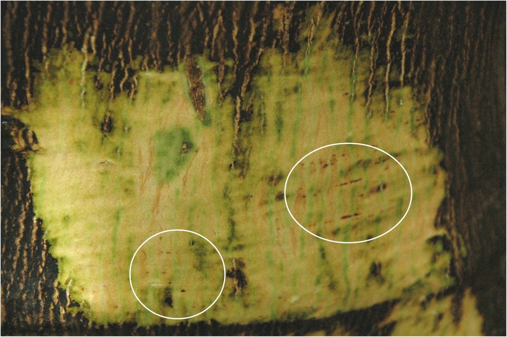 Trunk of a grapefruit grafted on sour orange mildly affected by Kassala disease. Scraping away outer layers of bark reveals the presence of gum-like streaks. (Government nursery, Kitiab, Sudan) – N. Duran-Vila