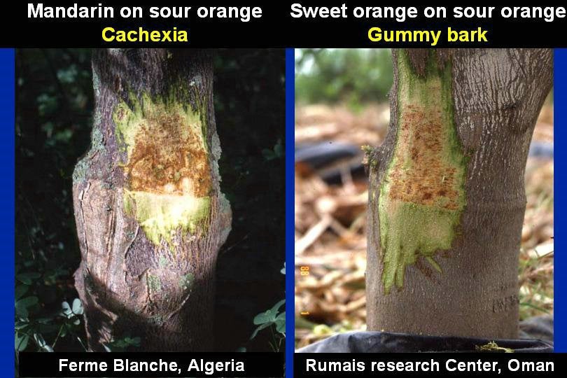 Symptoms of cachexia on mandarin grafted on sour orange (Ferme Blanche, Algeria) and symptoms of gummy bark on sweet orange grafted on sour orange (Rumais Research Center, Sultanate of Oman) – J.M. Bové |