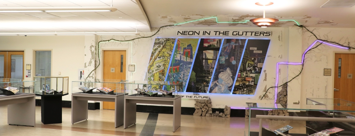 This exhibit will explore some of the ways cyberpunk has changed since its inception, how the visual design and language has evolved, how it has engaged with concepts like transhumanism and posthumanism, and how it continues to reshape itself as our technological landscapes change and evolve. View a digital version of the exhibit guide here or pick up a print copy in-person when you visit the exhibit.