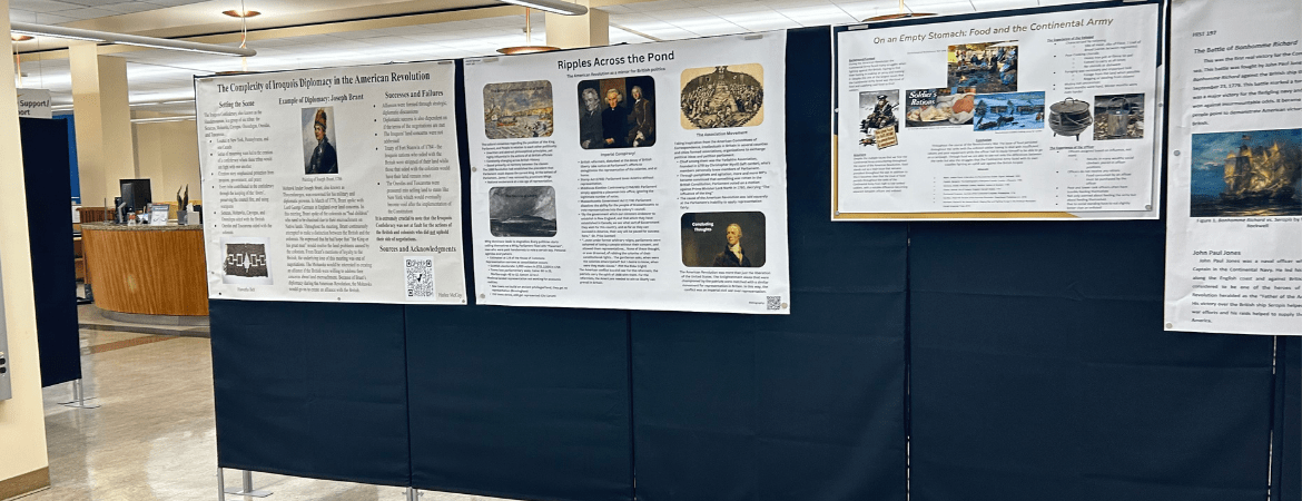 From March 15 through March 28, 2024, a poster exhibit near the Information Desk in the Tomás Rivera Library was on display that offered different perspectives on the American Revolution.