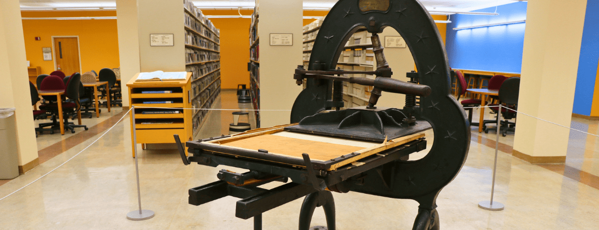 Previously kept in the stacks of Special Collections & University Archives on the fourth floor of the Rivera Library, the press is now accessible to all visitors on the first floor, located to the right of the Library Support/IT Support Desk.