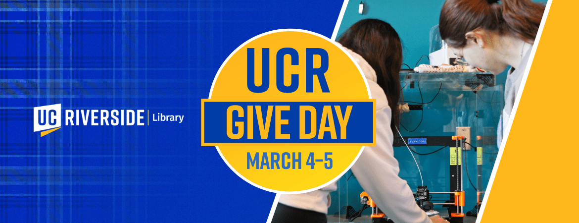 Give Day is a fully digital campaign. If you’re on the UCR Library’s contact list, you’ll receive a text message or email on March 4 with links to our Give Day pages. Want to make a difference today? You can make a gift early by visiting our Give Day landing page. You can also donate to any of our funds at library.ucr.edu/giving.