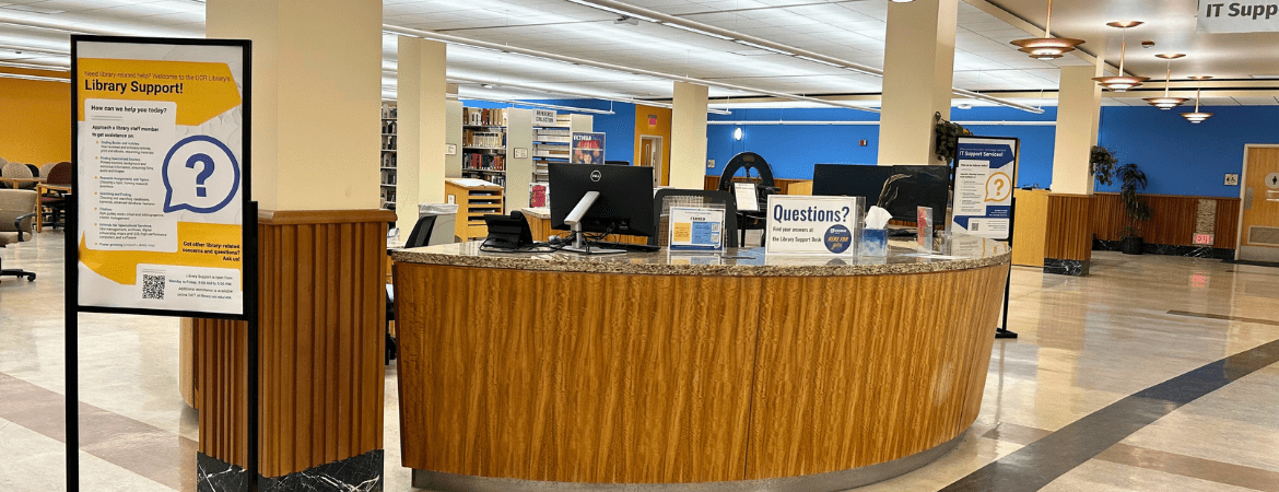 Students are encouraged to visit the Help Desk for a wide variety of questions, from finding books and e-books to developing effective search strategies. Librarians are also equipped to help students verify citations, particularly as issues with inaccurate references generated by AI tools have become more common.