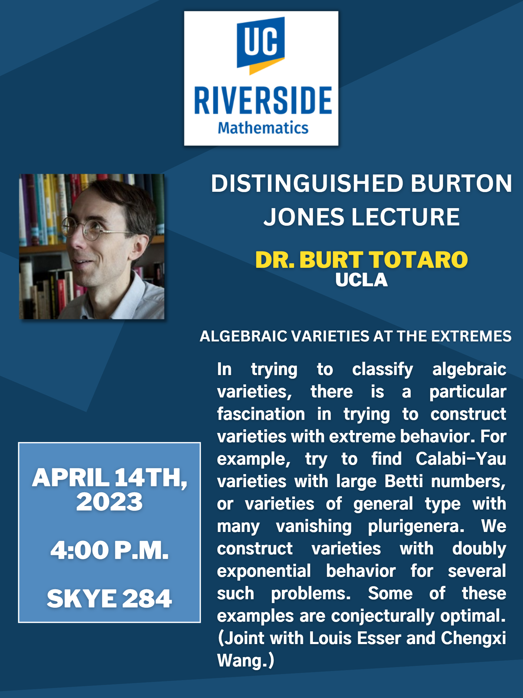 The lecture will take place on April 14th at 4:00 p.m. in Skye Hall 284. Dr. Totaro's lecture will be "Algebraic Varieties at the Extremes".