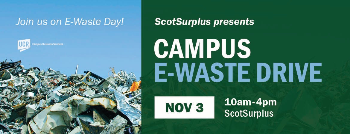 ScotSurplus Presents the Campus E-Waste Drive. Bring your unwanted or unworking electronics to the UCR Corporation Yard on Wednesday, November 3, from 10am-4pm. E-waste is a popular, informal name for electronic products nearing the end of their "useful life." Computers, televisions, VCRs, stereos, copiers, and fax machines are common electronic products. Many of these products can be reused, refurbished, or recycled.