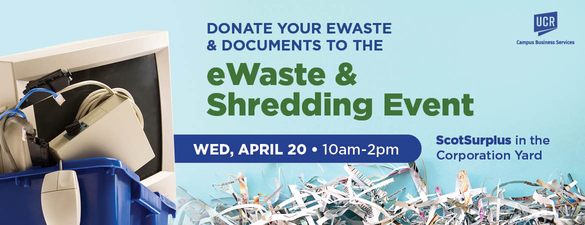 Highlanders, responsibly recycle your old eWaste and securely shred your old documents with us on Wednesday, 4/20/22 at ScotSurplus (UCR Corporation Yard, 3401 Watkins Dr.). Event runs from 10:00am to 2:00pm and we will accept personal and departmental items.