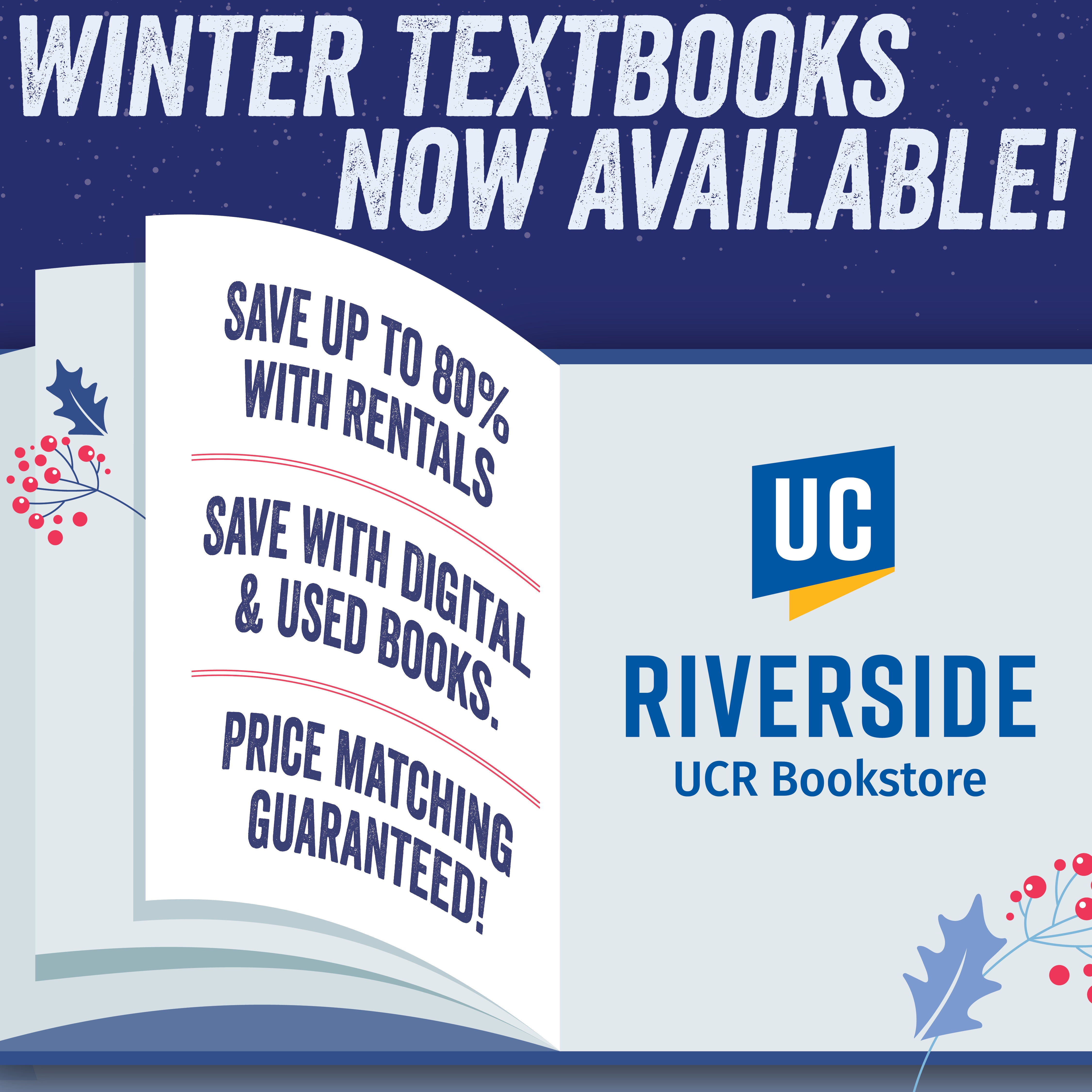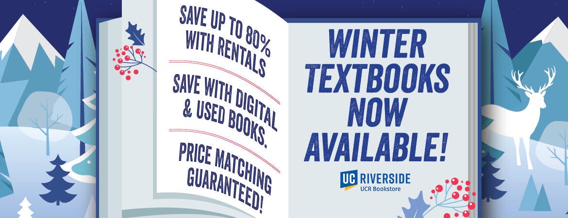 Textbooks for the 2023 Winter Quarter are now available at the UCR Bookstore.  Students can save up to 80% on textbook rentals with digital and used options available.  Find a better offer somewhere else?  No problem, the UCR Bookstore offers price matching.
