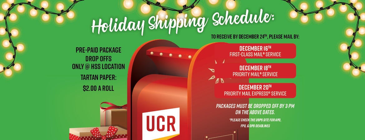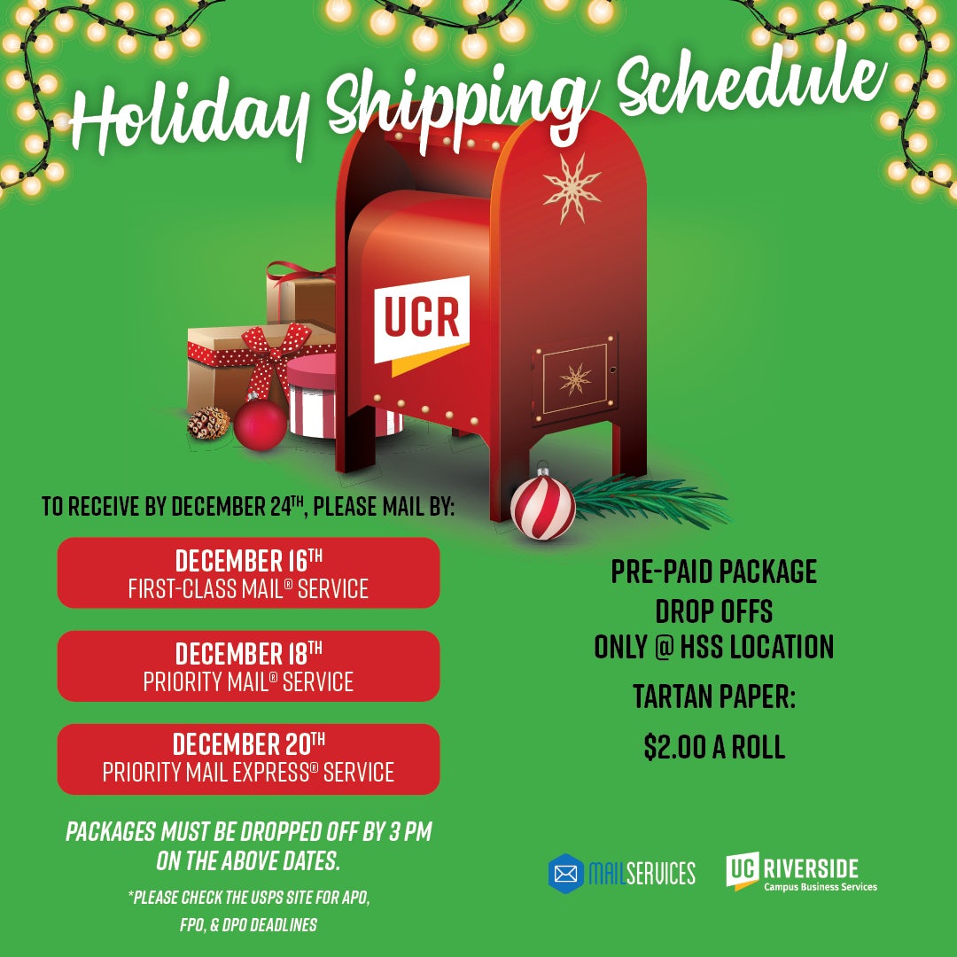 UC Riverside Mail Services has announced the ship by dates to ensure delivery by December 24.