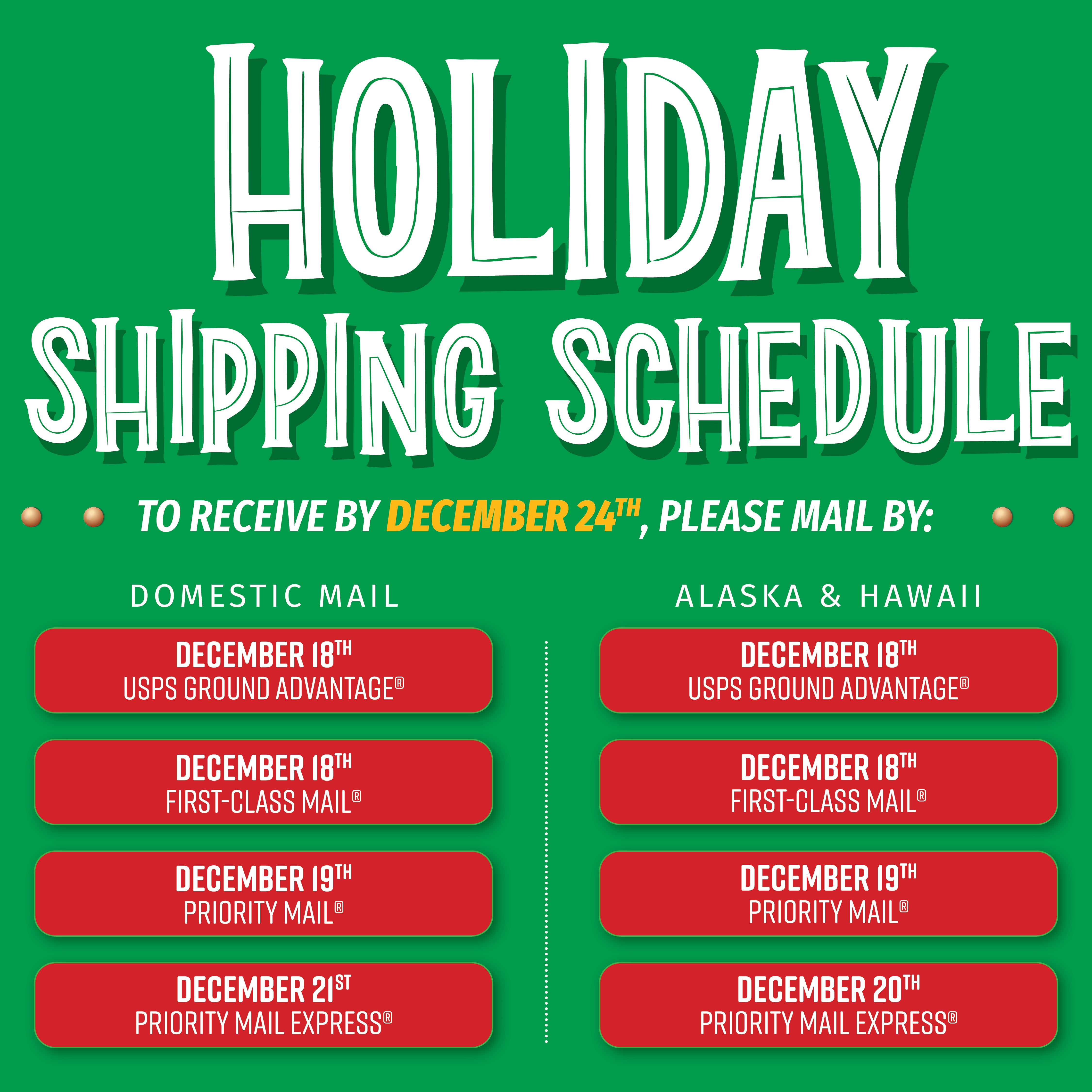 Priority Mail Express Service must be shipped by December 21 or December 20 if going to Alaska or Hawaii.