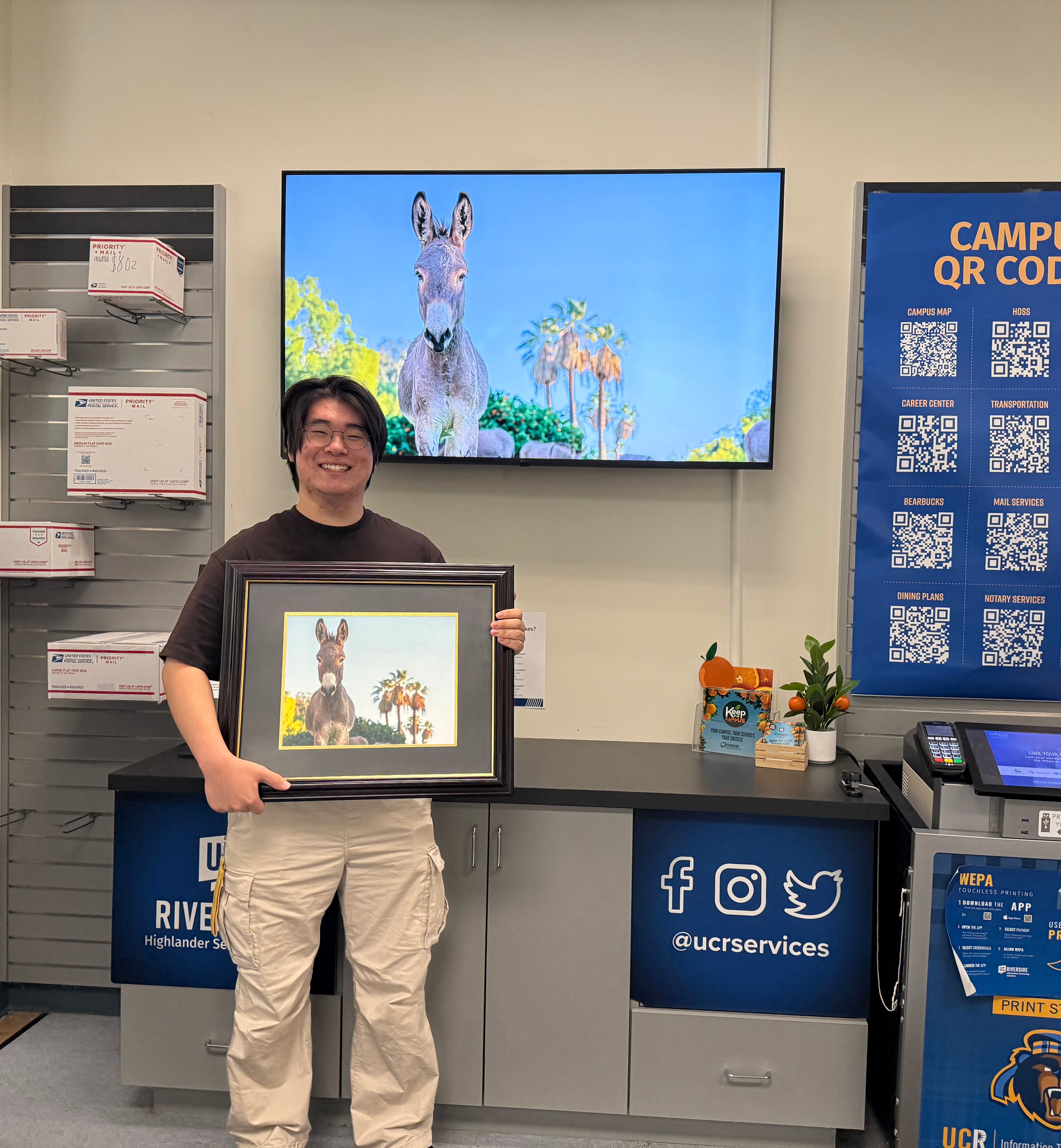 UC Riverside first-year business student Dennis Cha was selected as the winner of the 2025 R’Card photo contest on March 12. His winning image, which features a burro in front of palm trees under a blue sky, will be printed on thousands of new R’Cards distributed to students, staff, and faculty for the 2025-26 academic year.