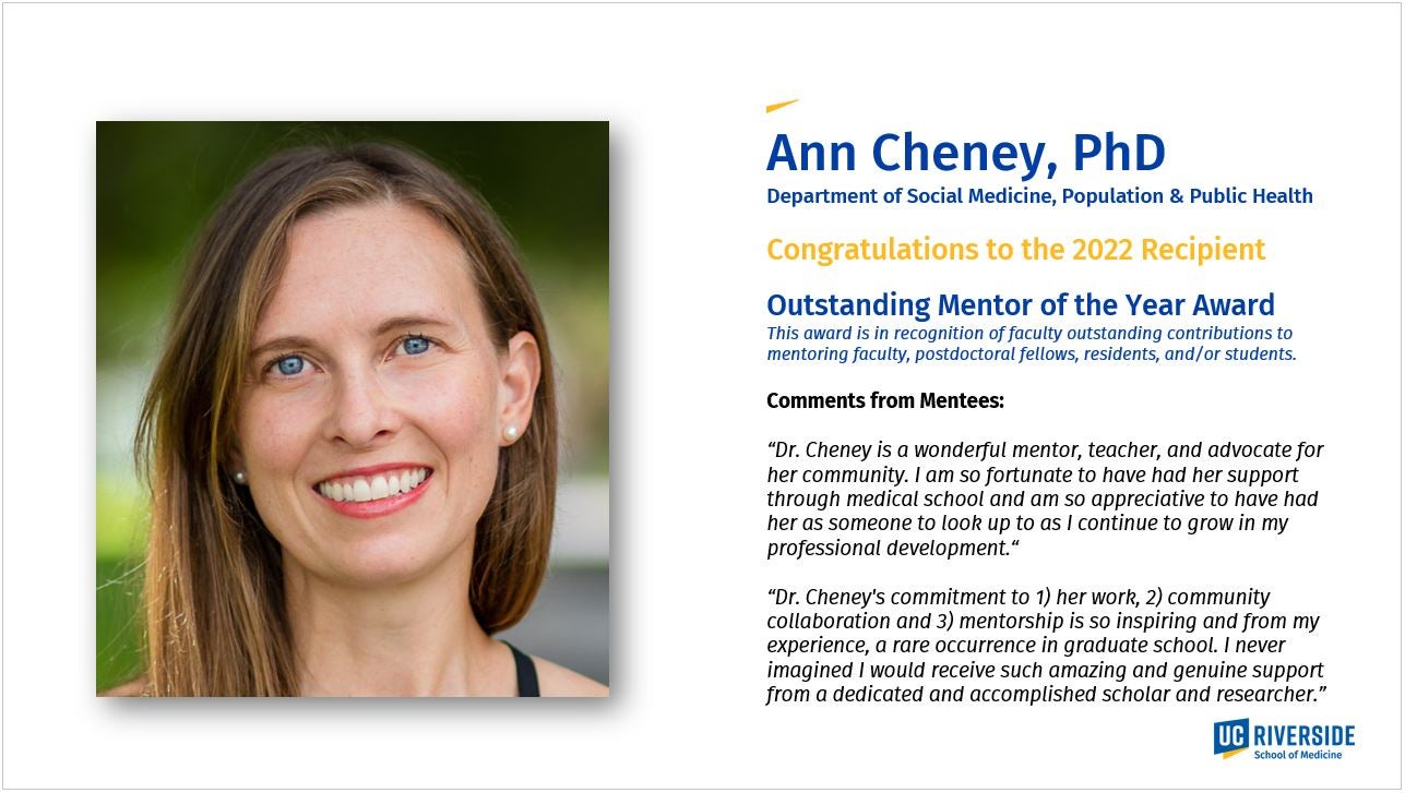 Ann Cheney, PhD, has been named the recipient of the UC Riverside School of Medicine's 2022 Outstanding Mentor of the Year award. The award is in recognition of a faculty member's outstanding contributions to mentoring other faculty, postdoctoral fellows, residents, and/or students. The announcement was made at the School of Medicine Dean's Town Hall on December 13, 2022.