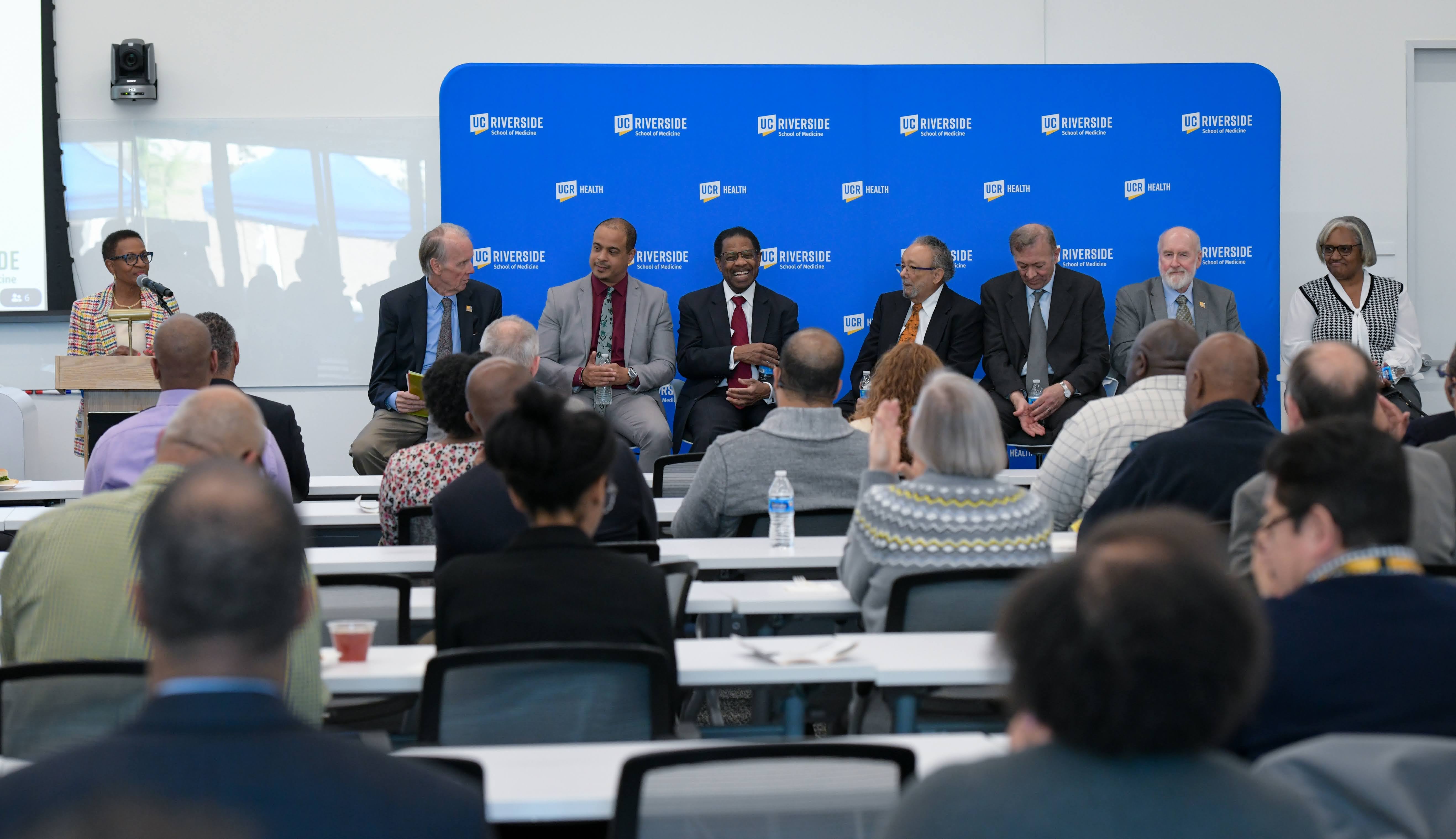 Event panelists included Ernest Levister, Jr., MD and Ancel Rogers, MD, both past presidents of the Vines Society; Thomas Haider, MD, a member of the UCR Board of Trustees and SOM Board of Advisors; Craig Byus, PhD, former dean and program director for the Division of Biomedical Sciences; Neal Schiller, PhD, the former senior associate dean and chair of biomedical sciences; Teresa Cofield, director of Pathway Programs at the SOM; and Michael Nduati, MD, chief academic officer of Universal Health Services Acute Care Division and associate clinical professor of health sciences. The panel discussion was moderated by Denise Martinez, MD, associate dean of diversity, equity, and inclusion at the UCR SOM.