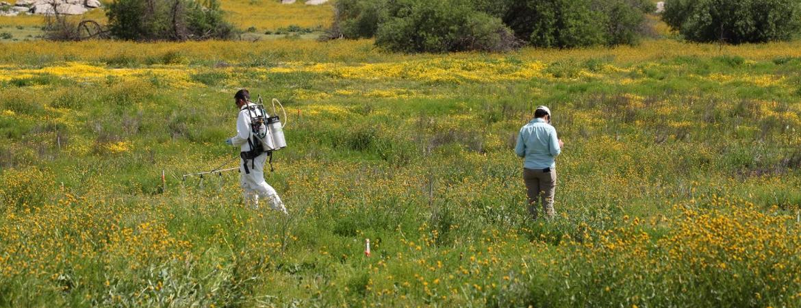 One of the symposium’s activities included a field trip to UCR’s Motte Rimrock Reserve in Perris Valley to observe the Stinknet invasion and highlight research to control it, like the work coming out of Larios’ lab.
