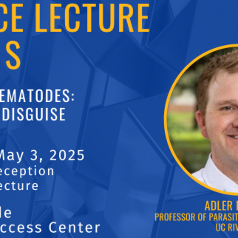 Adler Dillman, UCR Professor of Parasitology & Nematologist and Department of Nematology Chair presented his talk titled "Parasitic Nematodes: Masters of Disguise" at the 2025 CNAS Science Lecture Series on Saturday, 5/3/2025, in the UCR Student Success Center. These lectures are free and open to the public. For more information on this series and to...