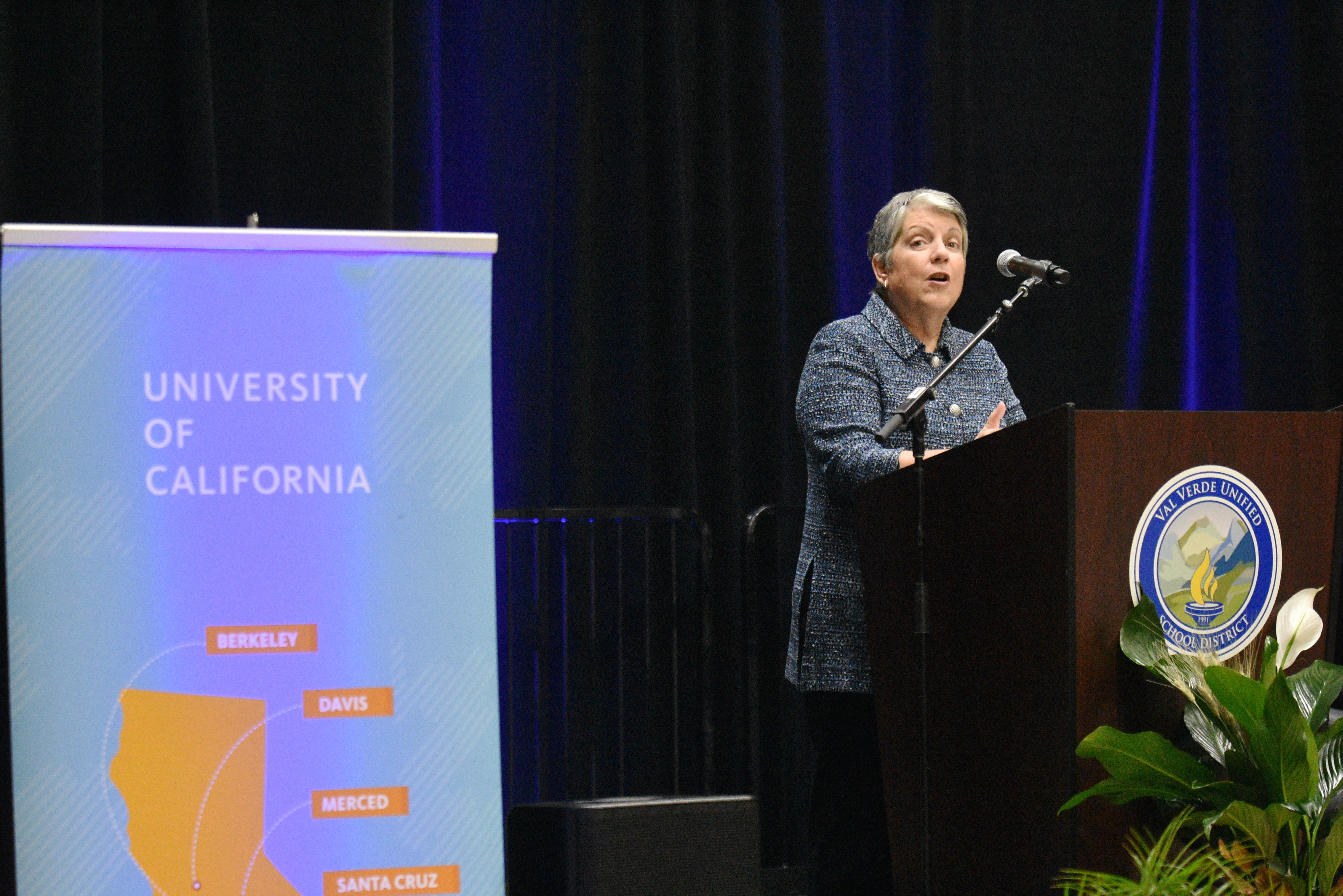 Napolitano’s visit to Rancho Verde High School is part of Achieve UC, an ongoing effort to encourage students in communities with low college-going rates to attain a high-quality college education.