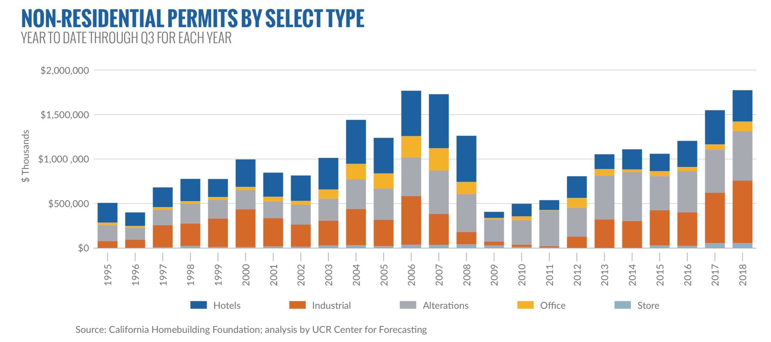 Although still trending below peak levels, construction employment in the Inland Empire has advanced nicely so far in 2018 (+6.2% year-to-date). This job growth is also evidenced by construction activity in the region: the total value of building permits increased 20.5% percent through the first three quarters of 2018.