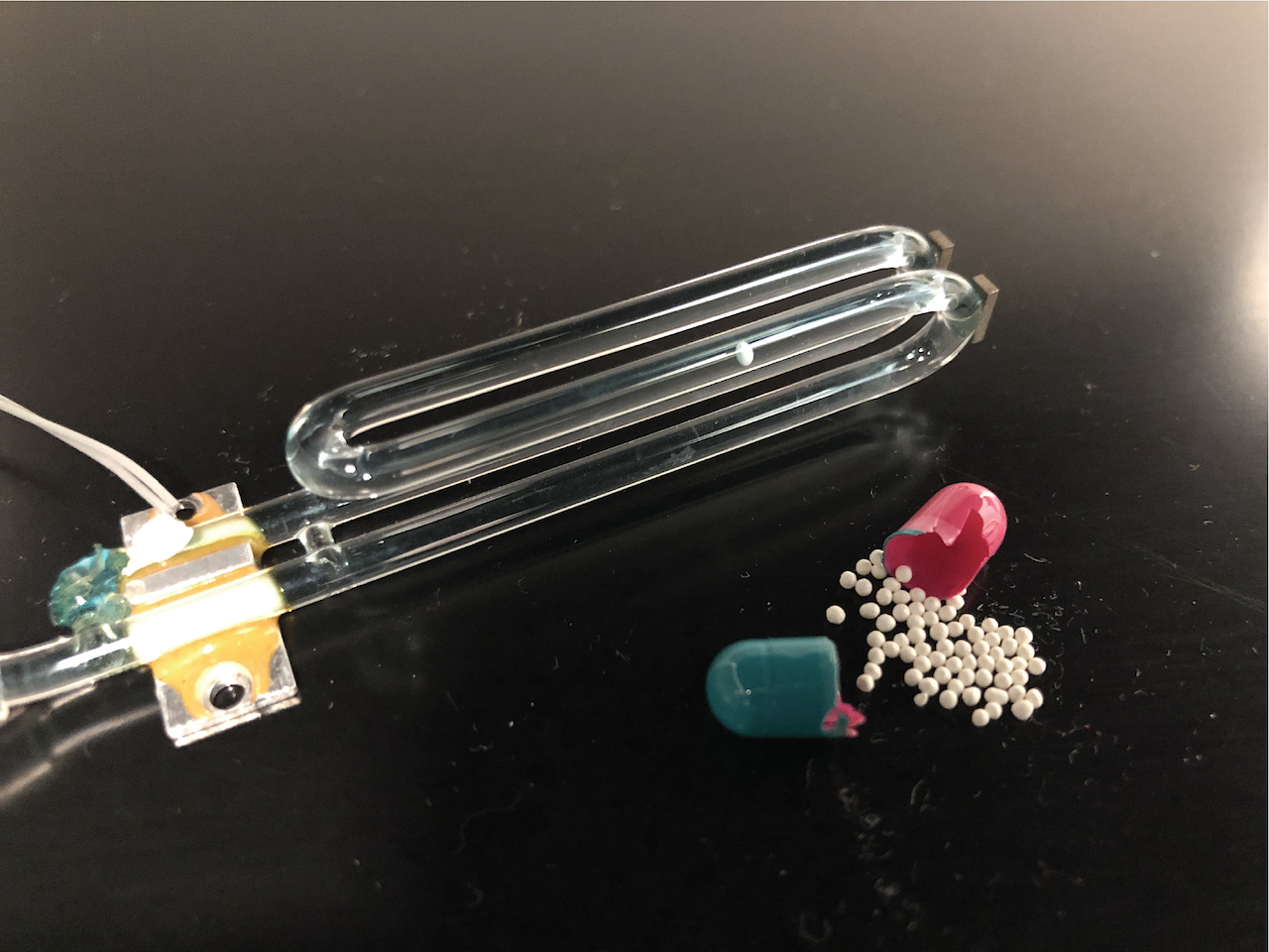 The group used a glass tube bent like a tuning fork, kept vibrating by a circuit at its resonance frequency, which was determined by the mass of the tube and its contents. When they filled the tube with simulated stomach and intestine contents and passed an over-the-counter time-release drug granule through the tube, they observed a brief change in the frequency.