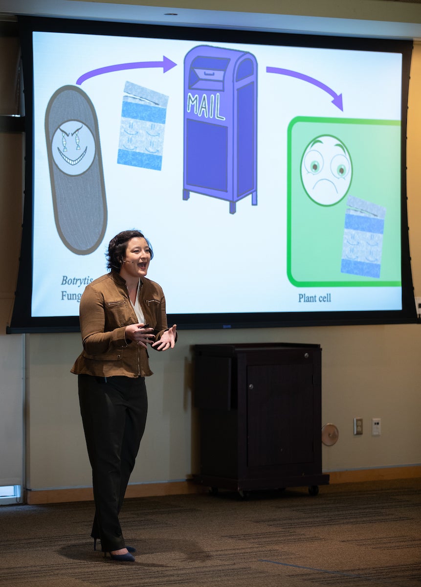Botrytis produces proteins that hide in “packages or envelopes” that eventually attack the plant’s defenses. Whitaker proposes new tools to disrupt that process. Her research focuses on eliminating those protective barriers, which in turn will allow for longer shelf life, minimizing food waste, and decrease crop loss experienced by farmers.