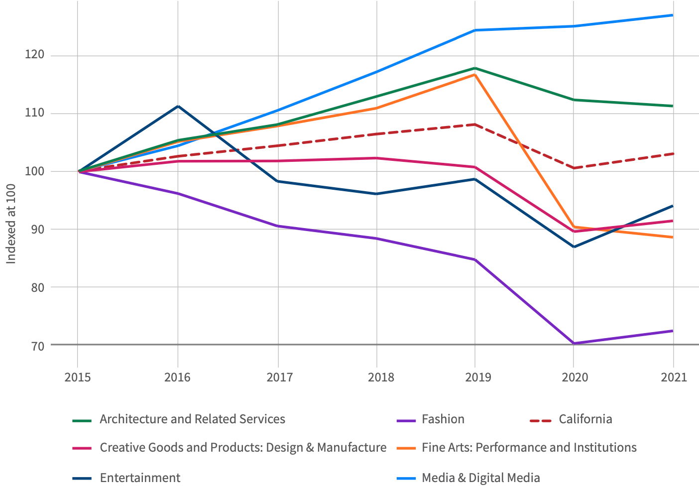 The architecture and related services sector is the only other major creative sector that had more jobs in 2021 than in 2015; all the others have lost employment since 2015. Unsurprisingly, fine arts and performance was hit hardest by the pandemic, given health mandated restrictions on group activity, and fashion stands out as the one sector that has been in almost steady employment decline since 2015.