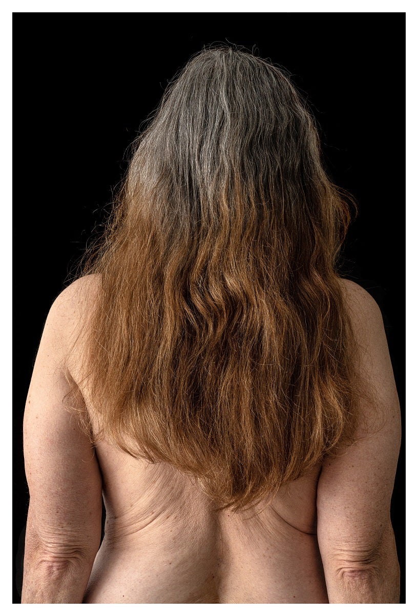 “In early middle age, after agonizing about my first gray hairs, I decide to dye my hair,” she said. During the lockdown she decided to let her hair grow out. In one image, her hair, divided between gray and dyed, spills down her naked back. The project is a testament to her honest examination of an aging woman and intrinsically tapping into her lifelong thematic interest of change and time. In total she photographed 17 parts of her body.