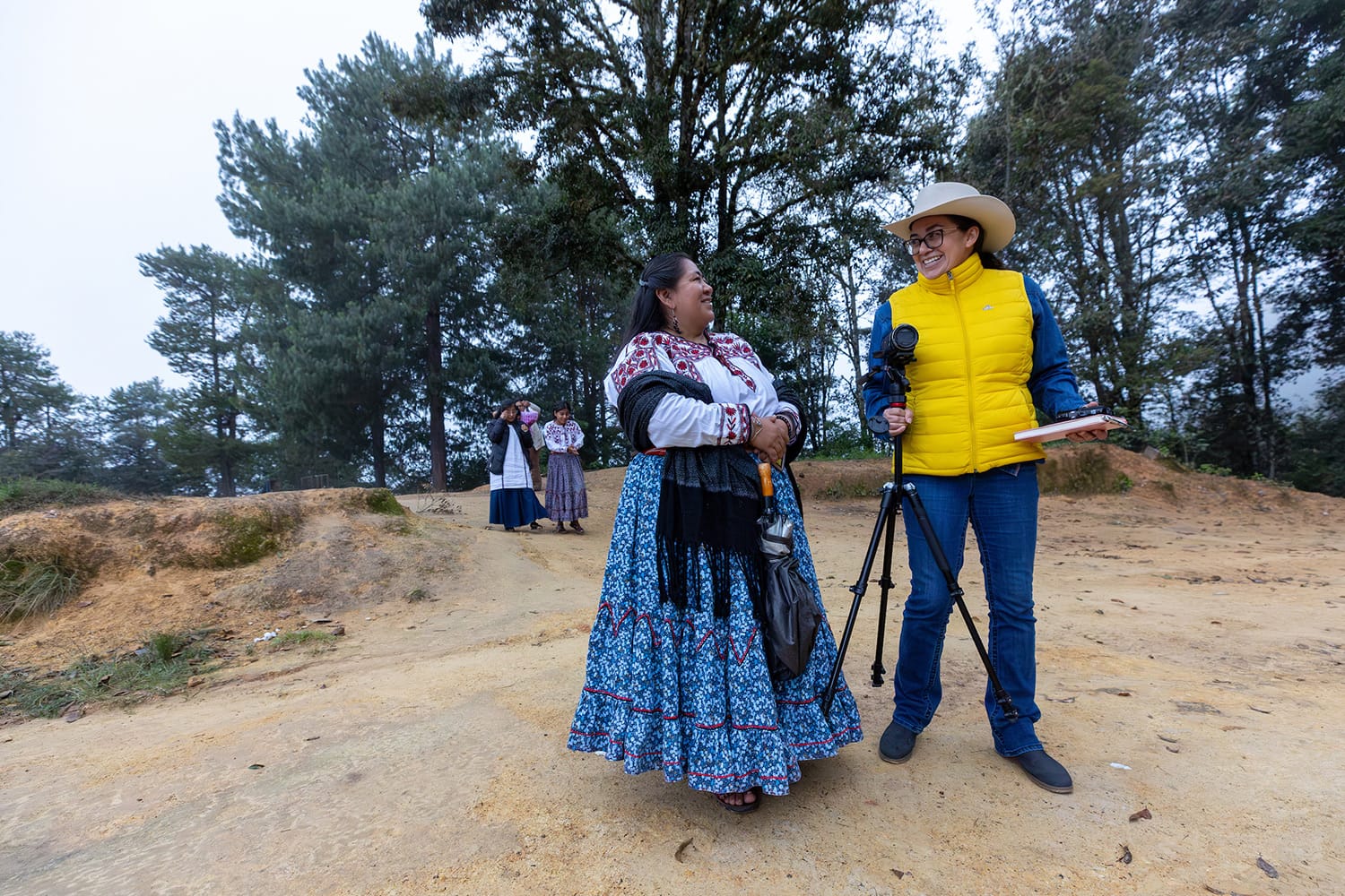 Upon her arrival in Tlahui in late August, Chávez set out to interview some of the women who make up Mujeres del Viento. Sitting on a tree trunk against the backdrop of verdant hills and evergreen pine trees, notepad in hand and camcorder on, she spends most of the day speaking to several of the band members. These women, and the rest of the band, speak Spanish as a second language; their mother tongues include Zapoteco, Mazateco, Mixteco, and Mixe. Mixe, also known as Ayuujk, is Tlahui’s native language.
