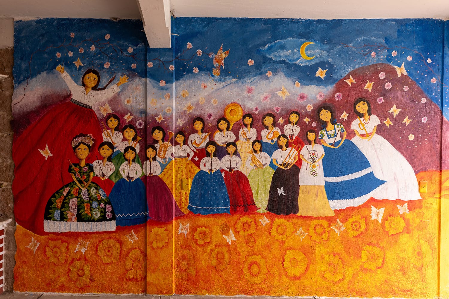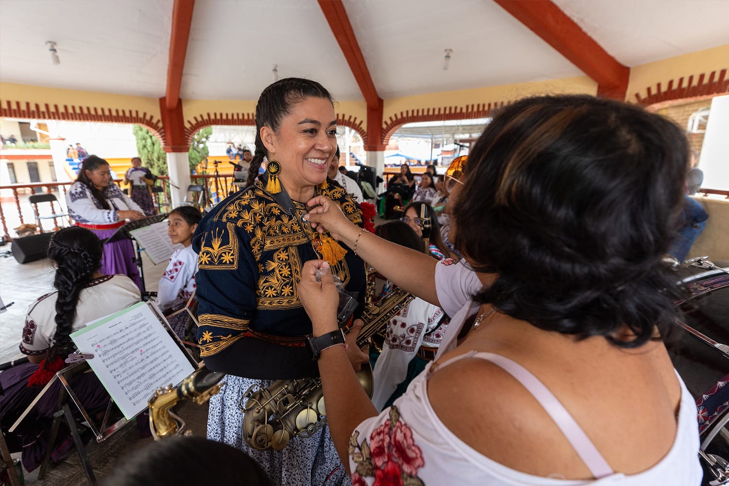 These Saturday afternoon concerts are a long-standing tradition in Tlahui. Featured bands play during the town’s bimonthly farmer’s market, surrounded by hundreds of vendors offering everything from furniture to sweet treats, live chickens, fruit, colorful dahlias, and much more. Mujeres del Viento Florido find their place in the town’s quiosco, a dome-shaped pavilion with an emblematic tuba and music note at its peak.