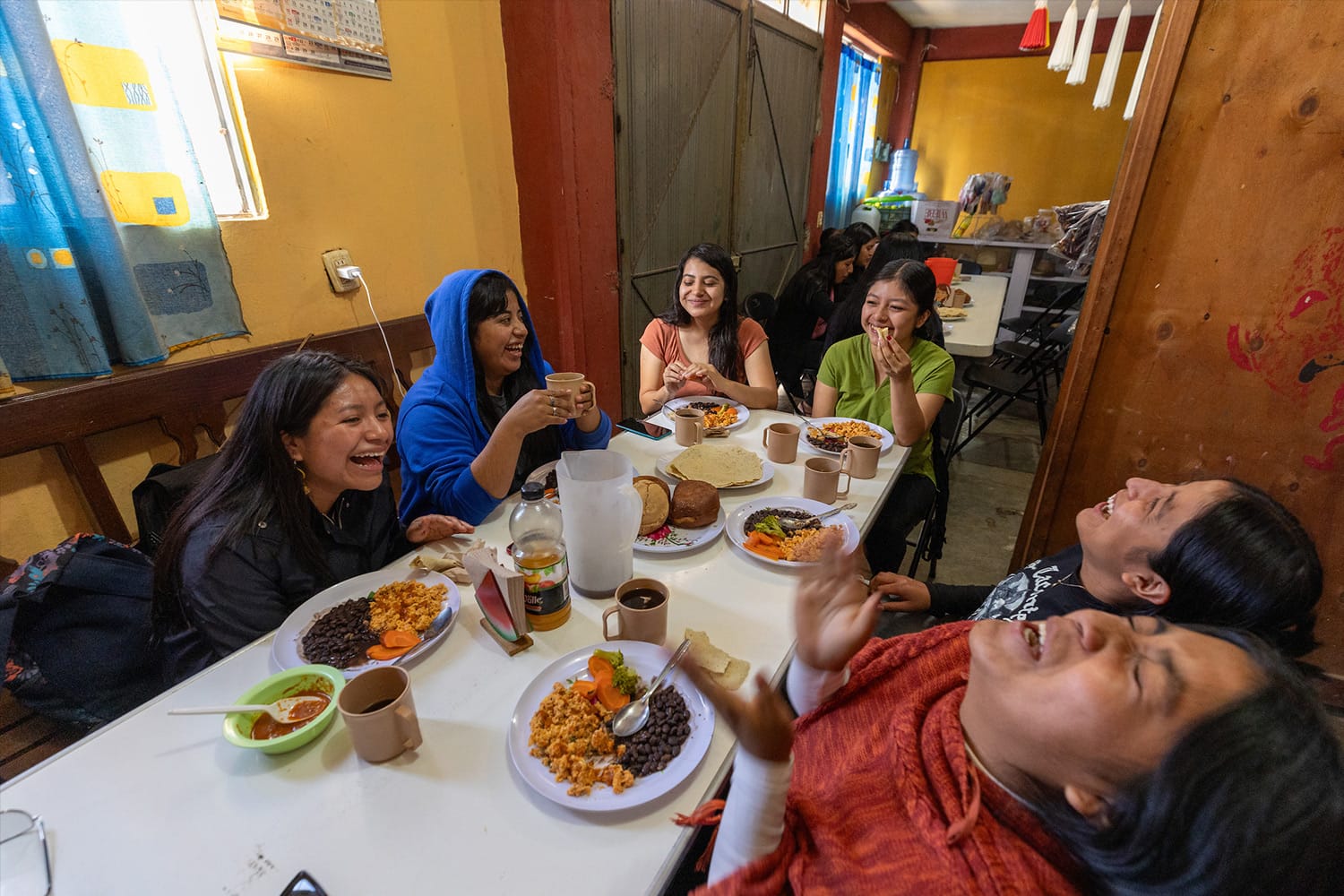 By 8 a.m. the next morning, the sound of music again booms throughout Gallardo Martínez’s home, while streaks of sunlight hit the exterior walls painted in peach and crimson. In the kitchen on the second floor, a big pot of coffee brews atop a clay comal over burning wood and a bag of traditional pan de yema (yolk bread) sits out for guests. Perfect for the chilly morning.