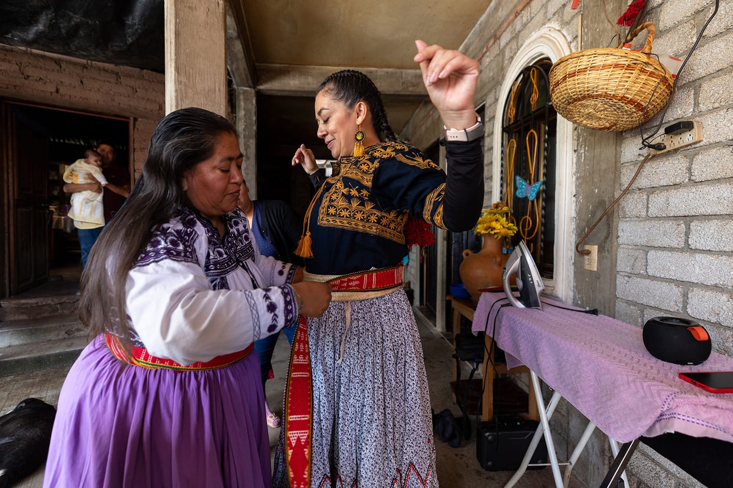 On the day of the concert, Gallardo Martínez helps Chávez dress in traditional garb, educating her on the significance of items such as the colorful belt around her waist. Called a tsum in Ayuujk, the embroidered belt is made of palm fiber and is meant to protect a woman’s back and womb when they are carrying heavy items.