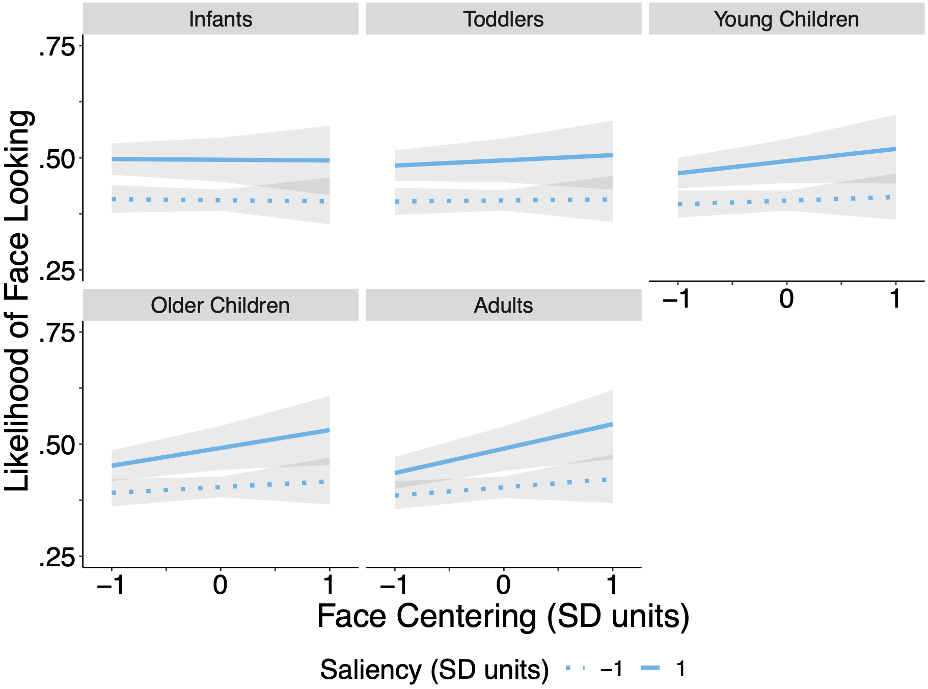 For infants and toddlers, only face salience served as a cue. They were more likely to fixate more salient faces. With age, centering emerged as a significant cue. By adulthood, salience and centering interact to boost the likelihood of face looking.