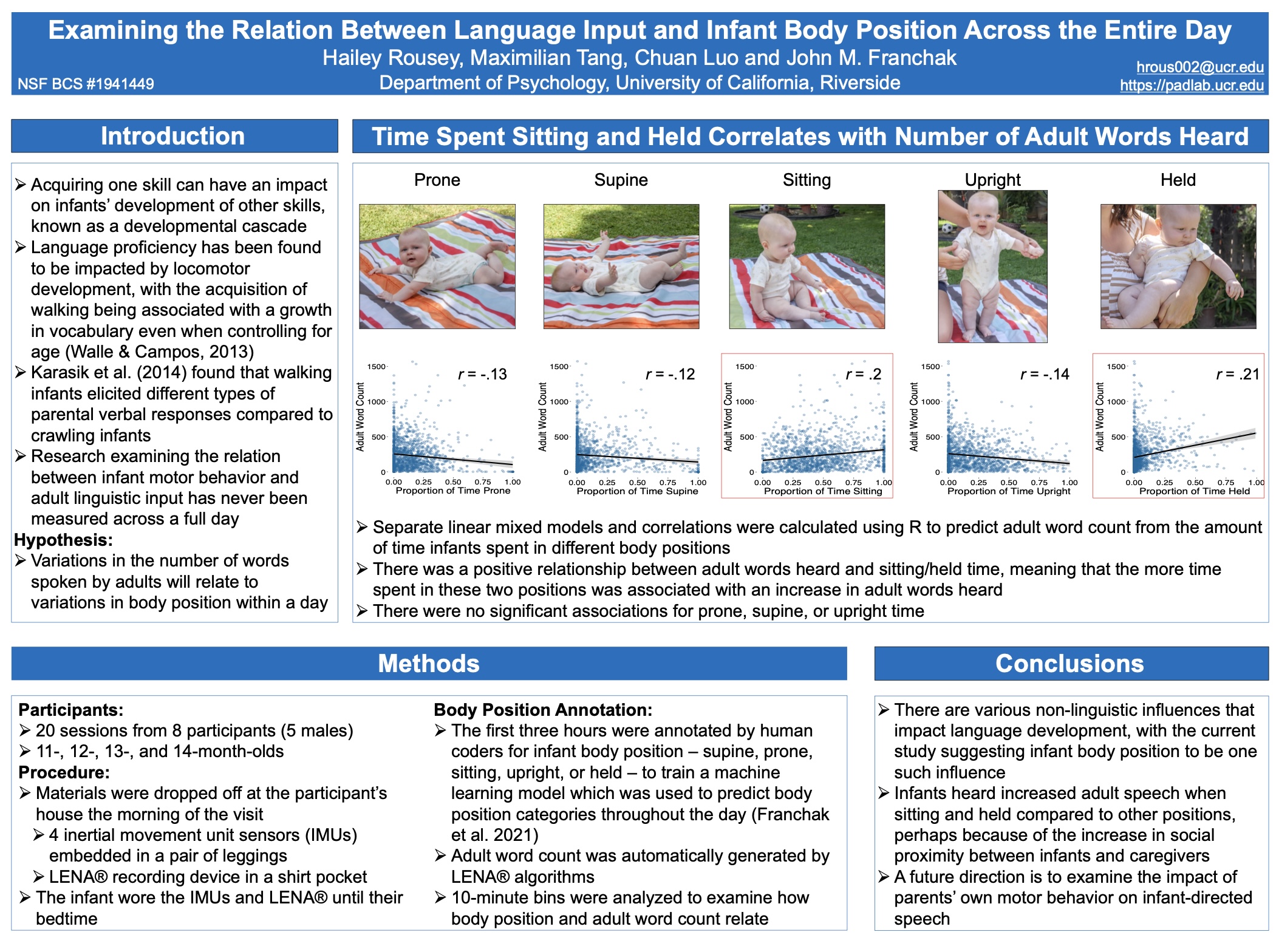 Hailey Rousey, Maximilian Tang, Chuan Luo, and John Franchak presented “Examining the Relation Between Language Input and Infant Body Position Across the Entire Day”