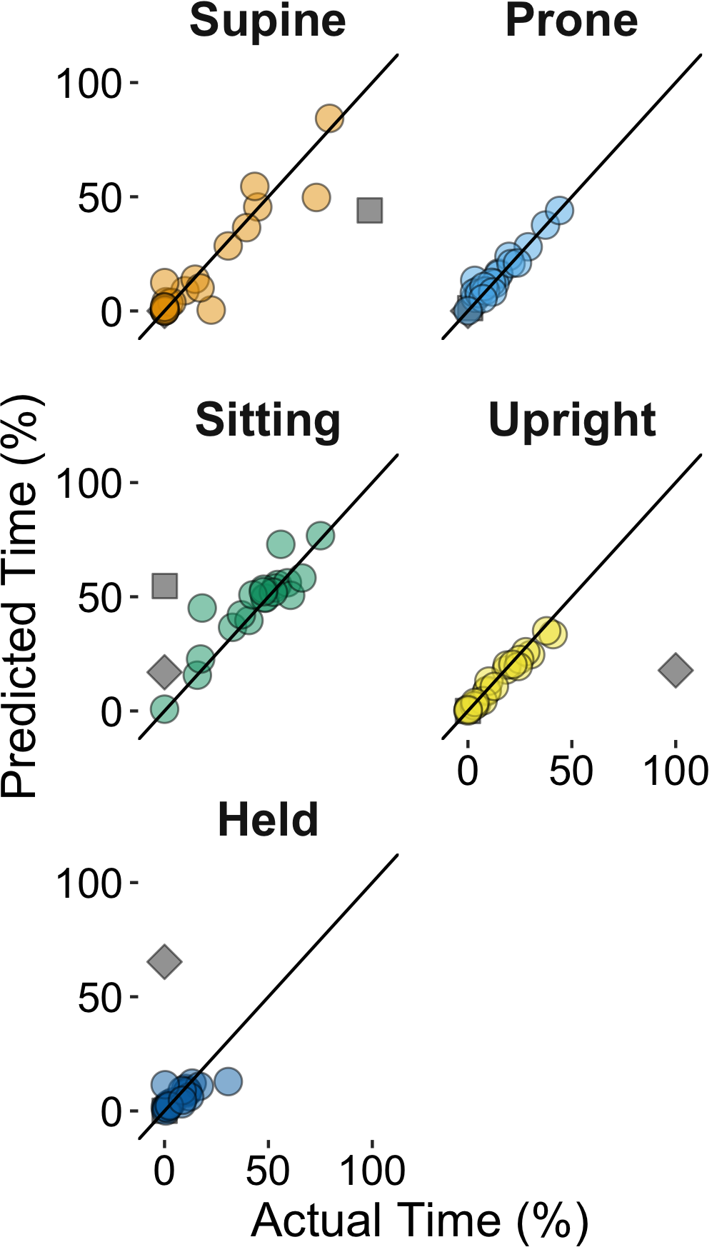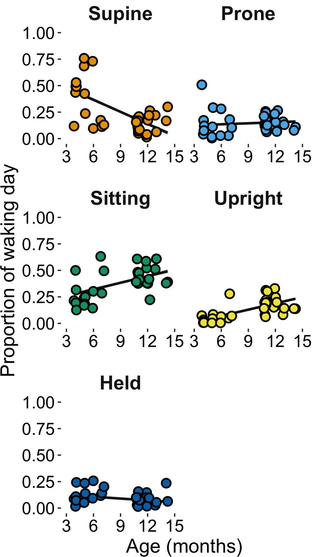 For example, we can use model predictions of sensor data—collected continuously across the entire day—to estimate how long each infant spent sitting, upright, held, prone, and supine. Those estimates, like past work, show that with age infants spend more time sitting and upright and less time supine.